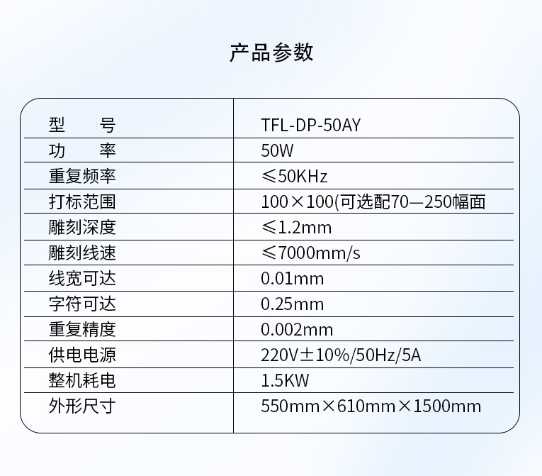 通發(fā)激光研發(fā)TFL-DP-50AY激光打標(biāo)機(jī),可針對各種金屬,塑膠進(jìn)行激光打標(biāo)加工,本激光鐳雕機(jī)配置成熟國產(chǎn)激光器,國產(chǎn)振鏡、國產(chǎn)軟件,性價(jià)比高,是普通金屬打標(biāo)機(jī)的好選擇!!!