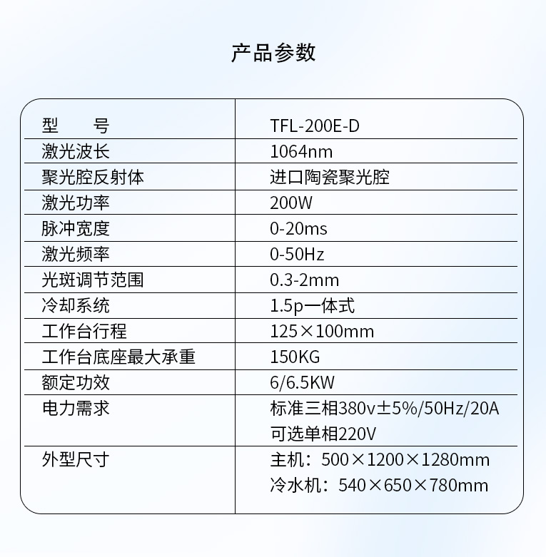 出口型模具激光焊機是通發(fā)激光公司專門為出口國外客戶使用而設計的系列機型TFL-200E-D,配置激光頭電動升降,同時配置操縱桿無極調速控制XY橫向和縱向電動移動。適用于各類精密注塑模具、壓鑄模具等模具激光修補焊接;同時也適合鑄件沙孔激光修補、模具崩缺激光修復、過切加工等的激光修補;各類金屬結構件、金銀首飾的激光焊接加工。