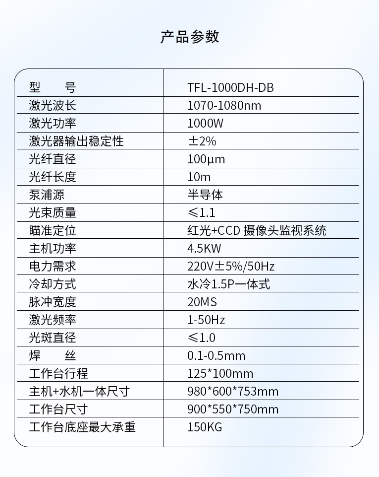 采用光纖激光器,反射率高,能量強,免維護,免調(diào)光,功耗少,相比傳統(tǒng) 模具焊來說,體積小,安全,穩(wěn)定性好超長使用壽命。 1000W光纖激光器,滿足銅、鋁焊接量大的模具及產(chǎn)品焊接加工需要。 高承重底座及工作臺,保持輕便靈活的優(yōu)點,同時提供更高承載能力。 配備.1.5P大功率一體式水冷水機,保證了大功率焊接的穩(wěn)定性。